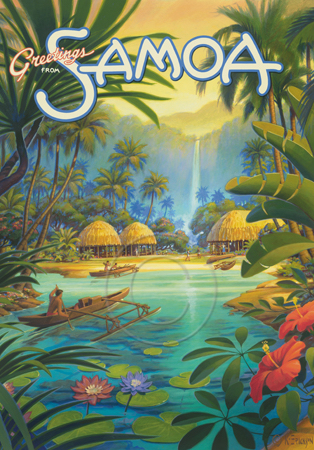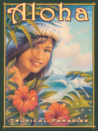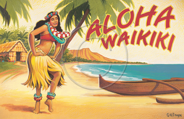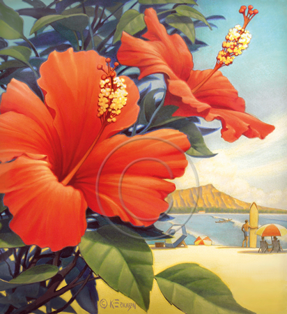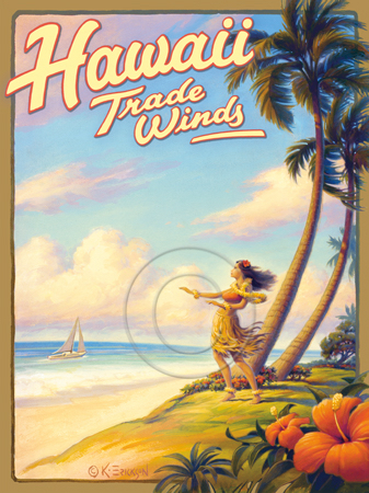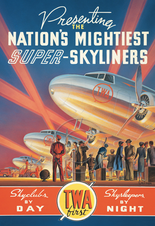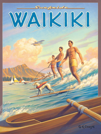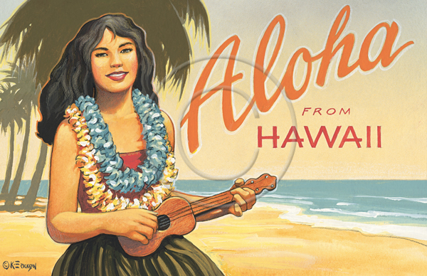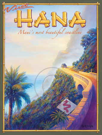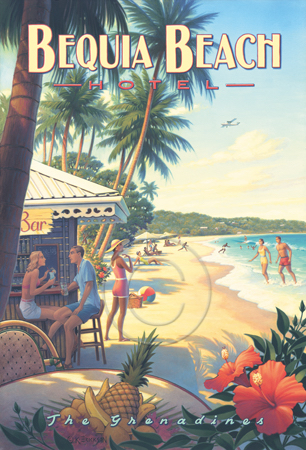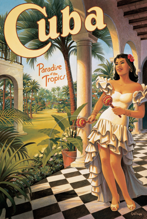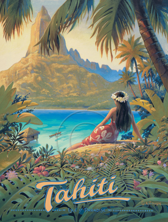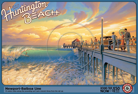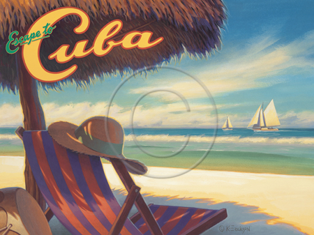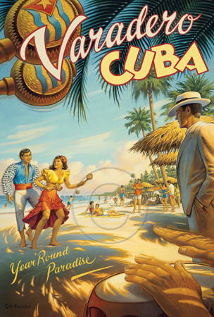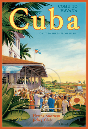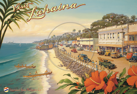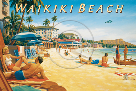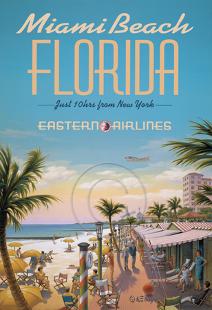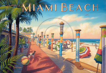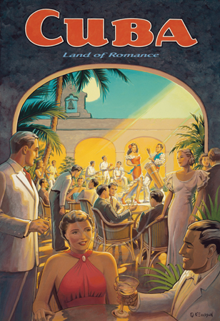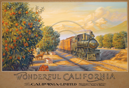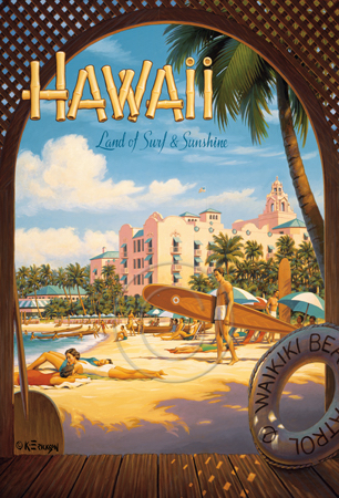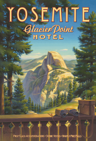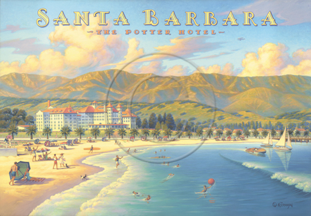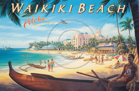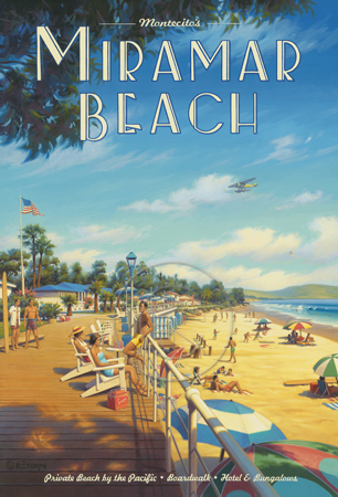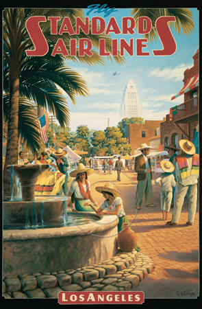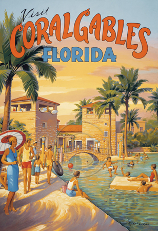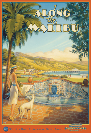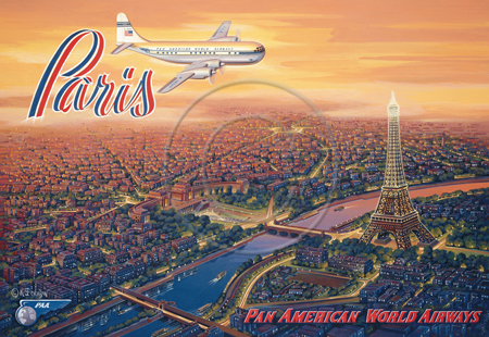 The images above may seem familiar since hey have been reproduced as posters and distributed around the world. They are often considered to be vintage travel posters created by an artist living and working sometime around the 1930’s or so. If the artist’s signature is noticed, it is assumed that he must be long since deceased. But in fact, “I am still very much alive and painting most every day”! Since the late 1990’s I have been painting this series which, in art classification terms, could fall into the categories of Pop Art and/or Retro Realism. These works have been inspired by the types of old images which appeared on post cards, magazine advertisements, travel posters and on other ephemeral items. However, they first came into being in my studio in collaboration with Greg Young Publishing. They have been reproduced as posters but the art exists as original paintings often presented in custom gold leaf frames. Most have been sold to art collectors. Some are still available and noted below.