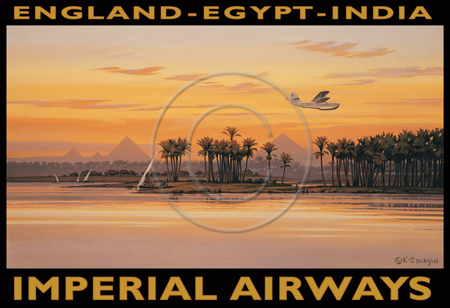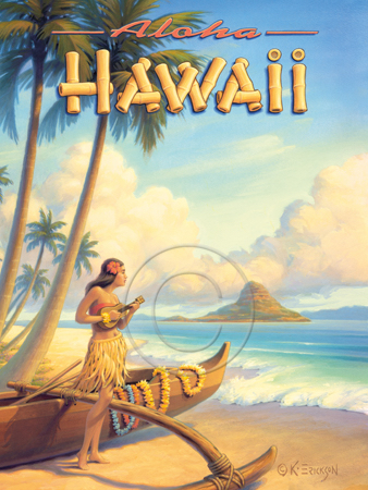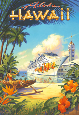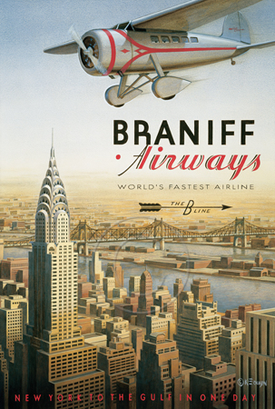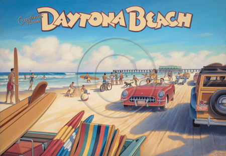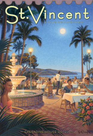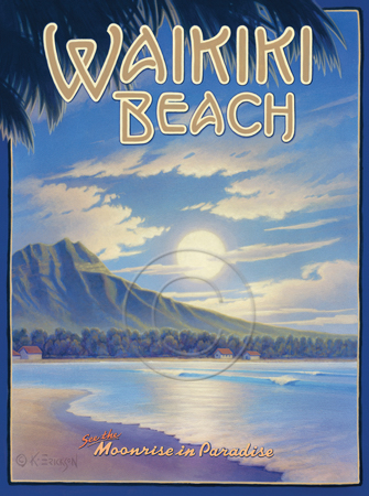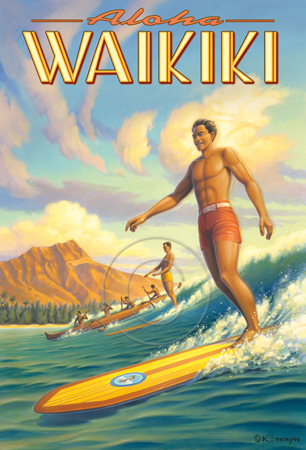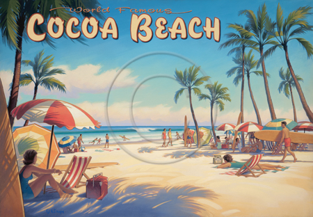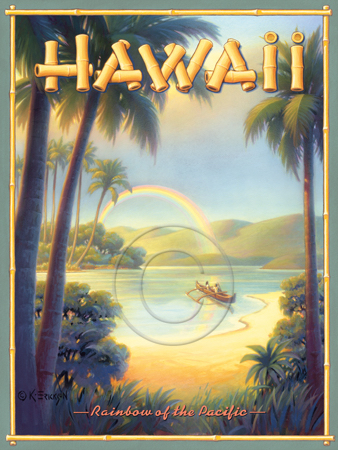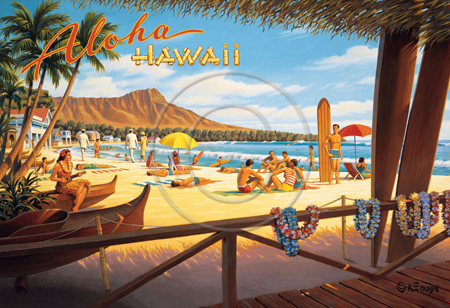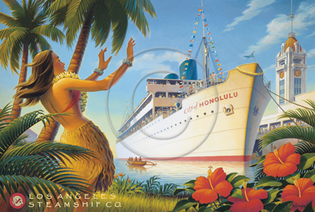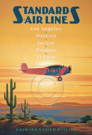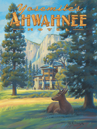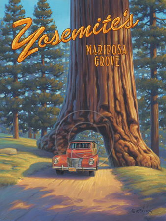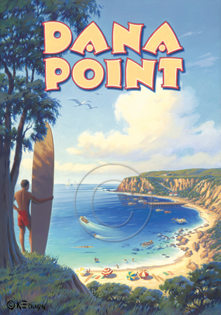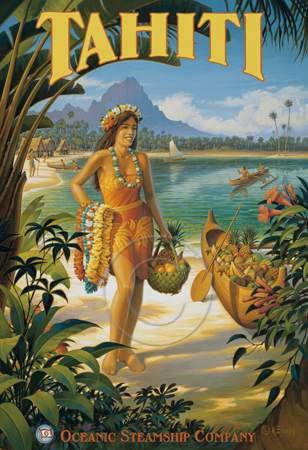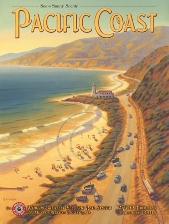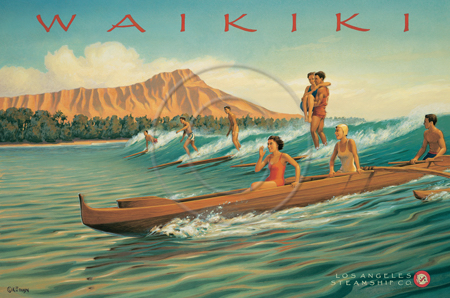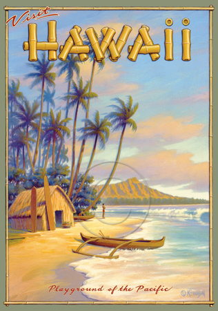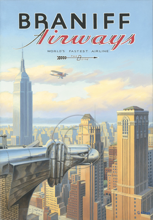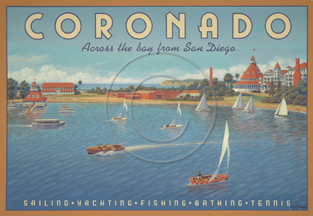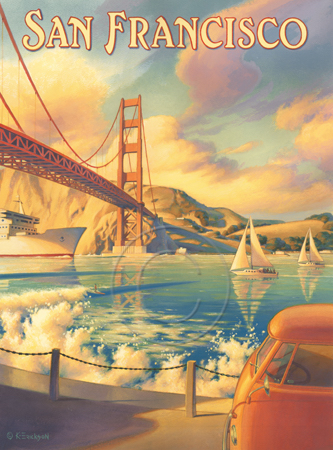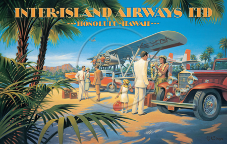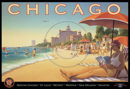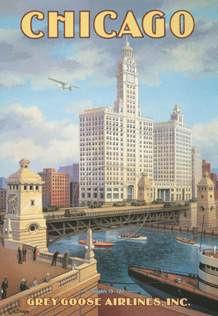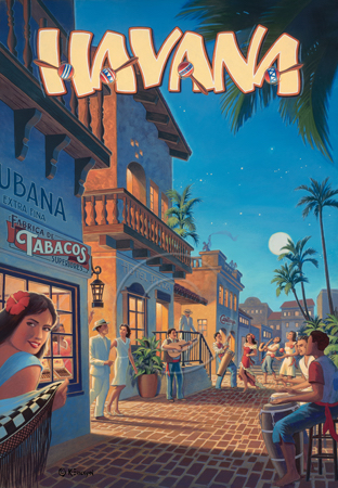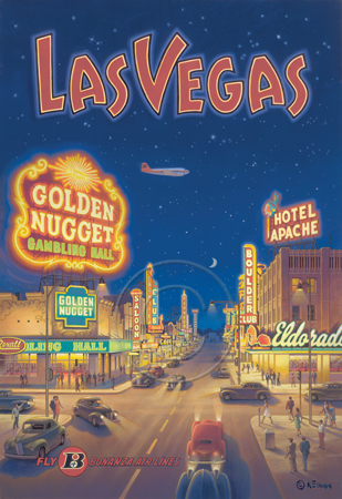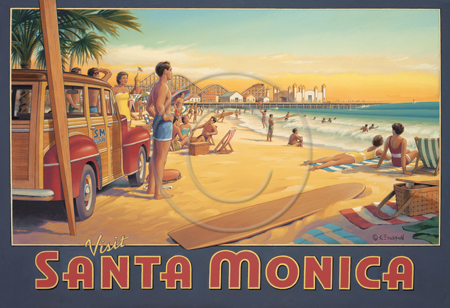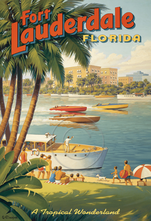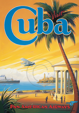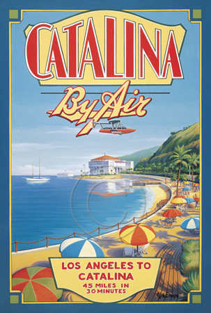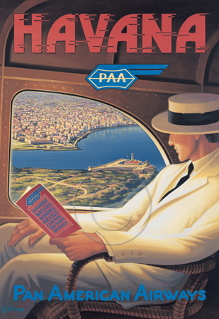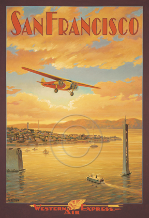 The images above may seem familiar since hey have been reproduced as posters and distributed around the world. They are often considered to be vintage travel posters created by an artist living and working sometime around the 1930’s or so. If the artist’s signature is noticed, it is assumed that he must be long since deceased. But in fact, “I am still very much alive and painting most every day”! Since the late 1990’s I have been painting this series which, in art classification terms, could fall into the categories of Pop Art and/or Retro Realism. These works have been inspired by the types of old images which appeared on post cards, magazine advertisements, travel posters and on other ephemeral items. However, they first came into being in my studio in collaboration with Greg Young Publishing. They have been reproduced as posters but the art exists as original paintings often presented in custom gold leaf frames. Most have been sold to art collectors. Some are still available and noted below.